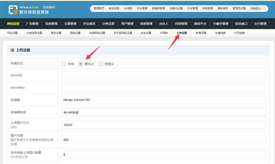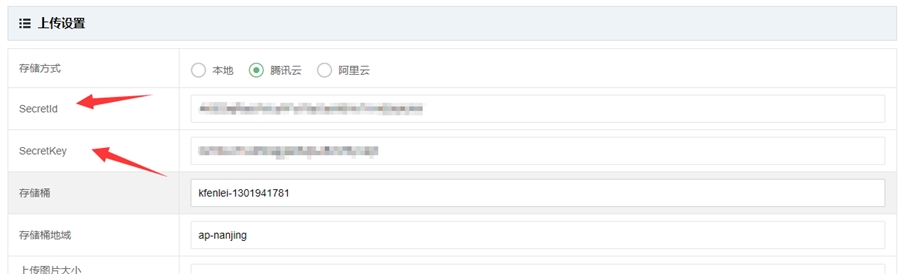 创建好后,把存储桶名和地域填到自己网站后台【上传设置】中,存储方式选择腾讯云,如图