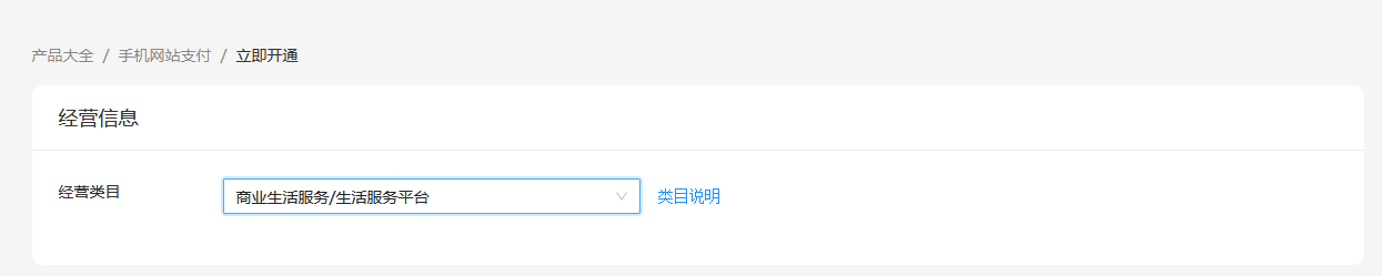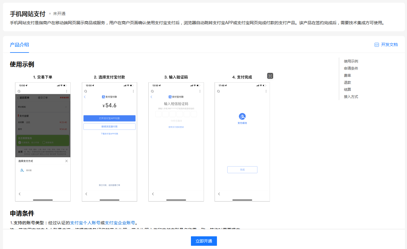 下面是【手机网站支付】申请开通步骤,点击【手机网站支付】后会出现开通的介绍页面,直接点击【立即开通】