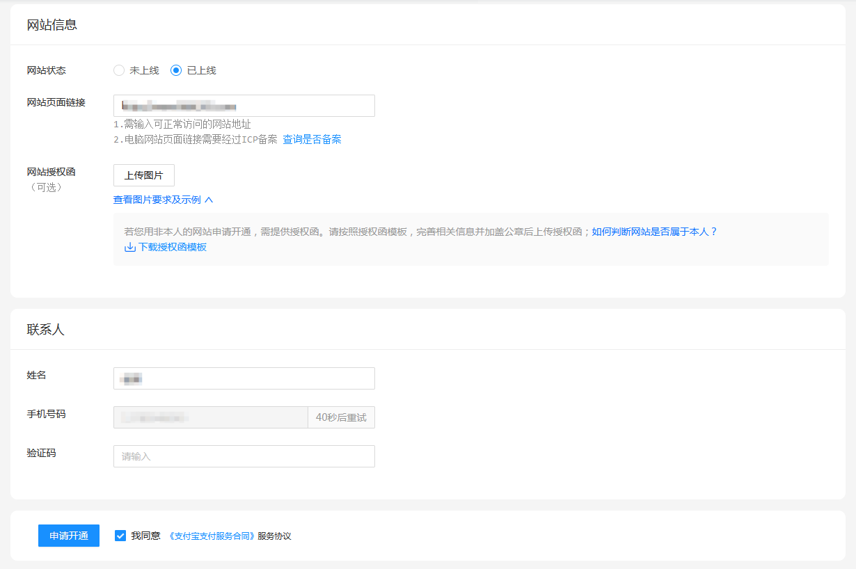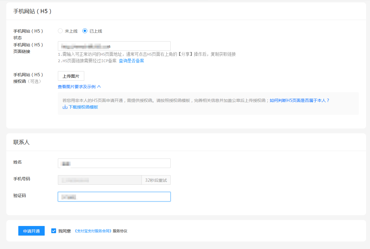 输入手机网站链接、联系人姓名、手机号和验证码后,点申请开通。