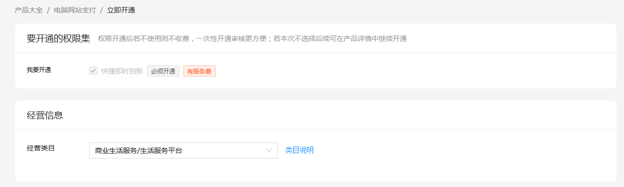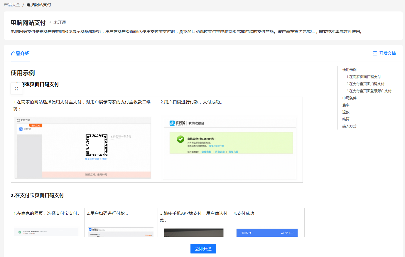 回到【产品中心】再点击【电脑网站支付】跳转到开通介绍页面。直接点击【立即开通】