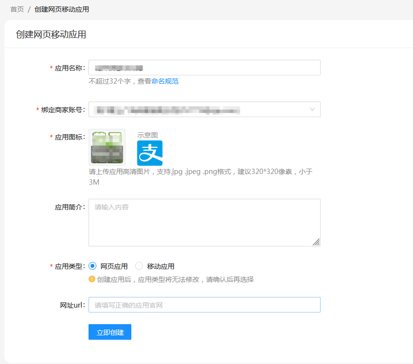 输入应用名称,选择绑写下商家账号,一般只有一个选择。上传应用图标,应用类型选择【网页应用】。提交创建。