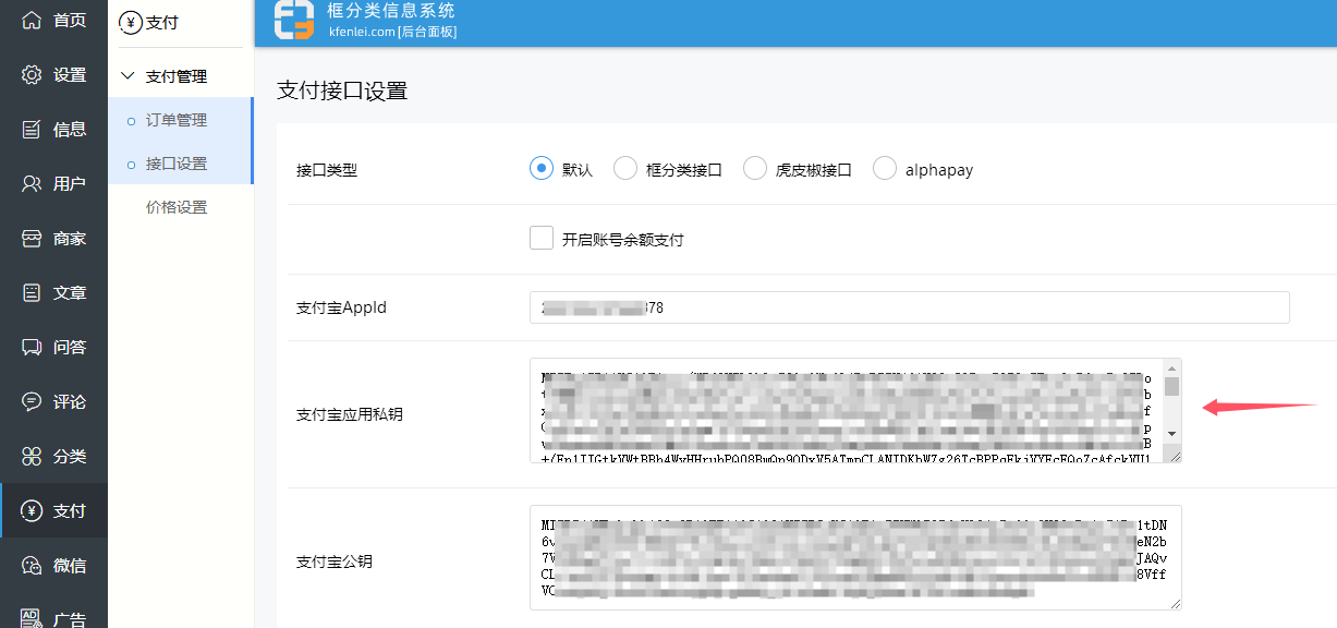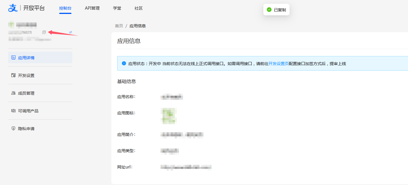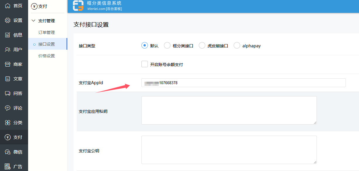 粘贴到网站后台支付 - 接口设置中的支付宝APPID中。