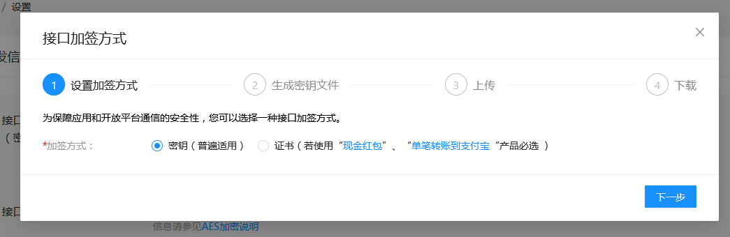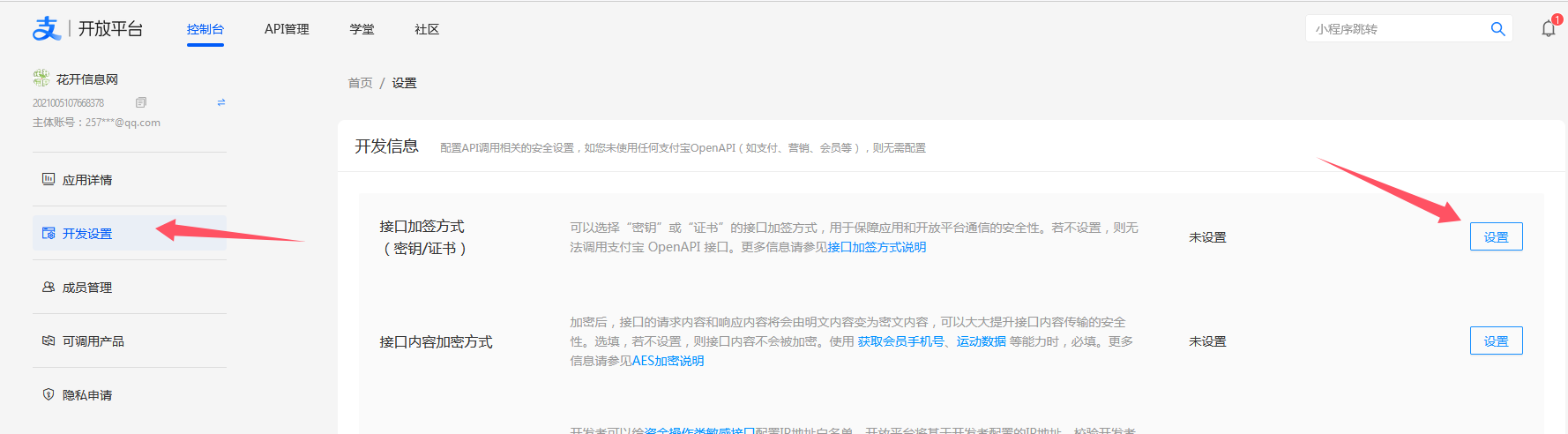 然后点击开发设置,接口加签方式(密钥/证书)设置。