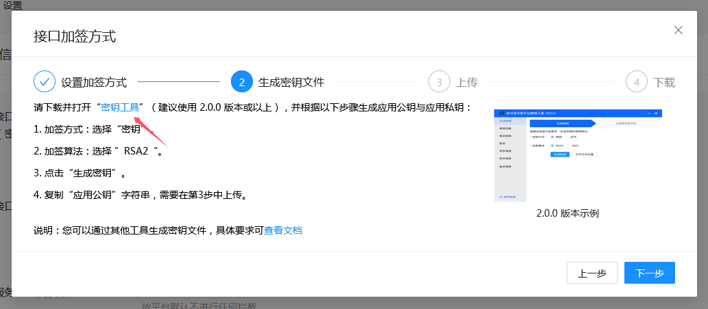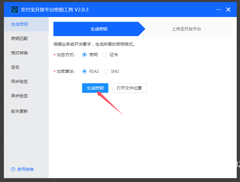 打开安装好的密钥工具,生成密钥,加签方式默认选择密钥,加密算法默认RSA2