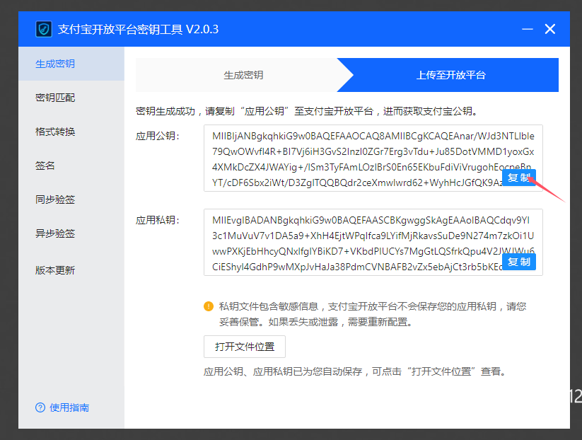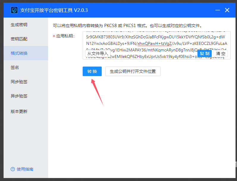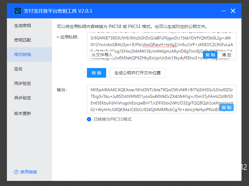 然后回到密钥生成工具,复制应用私钥。点击格式转换,将应用私钥粘贴上,点击转换。(这步很重要,如果不转换私钥而直接填写到后台会出现支付错误)