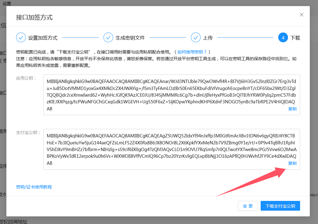 上传成功后会生成支付宝公钥,复制支付宝公钥。填写到网站后台支付接口的支付宝公钥中。