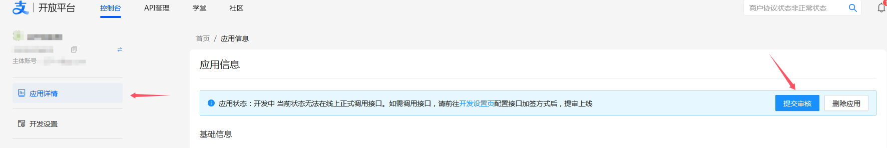 最后返回支付宝开方平台,找到你创建的应用,点击详情。提交审核,审核通过后就可以使用支付宝收款了。