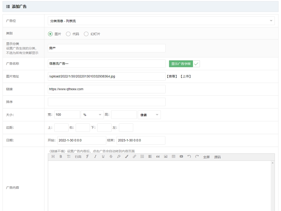 链接和广告内容选填,如果填了链接,点击图片后会跳转到链接,如果填写了广告内容,点击图片会跳转到系统自动生成的广告页面,显示广告内容。