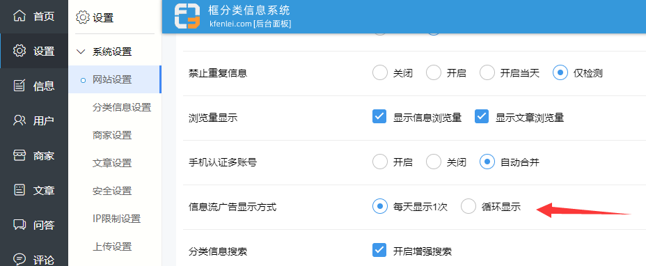 三、可设置每条广告同用户一天只显示一次,或循环显示。