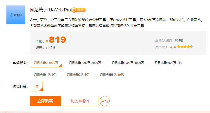 据了解,友盟统计的收费标准是按照PV计算的,如月日志量0-1000万,1年的套餐价格为819元;月日志量1000万-2000万,1年的套餐价格为1569元;月日志量2000万-4000万,1年的套餐价格为3109元;