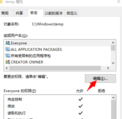 找到c:\windows\temp 文件夹,右键属性,安全,编辑