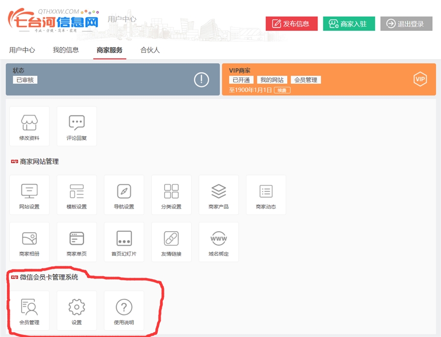 开通VIP后,登录商家账号,就可以在商家服务中,看到微信会员卡管理了