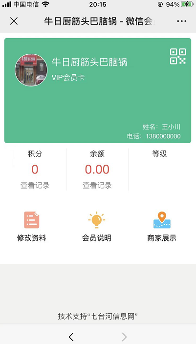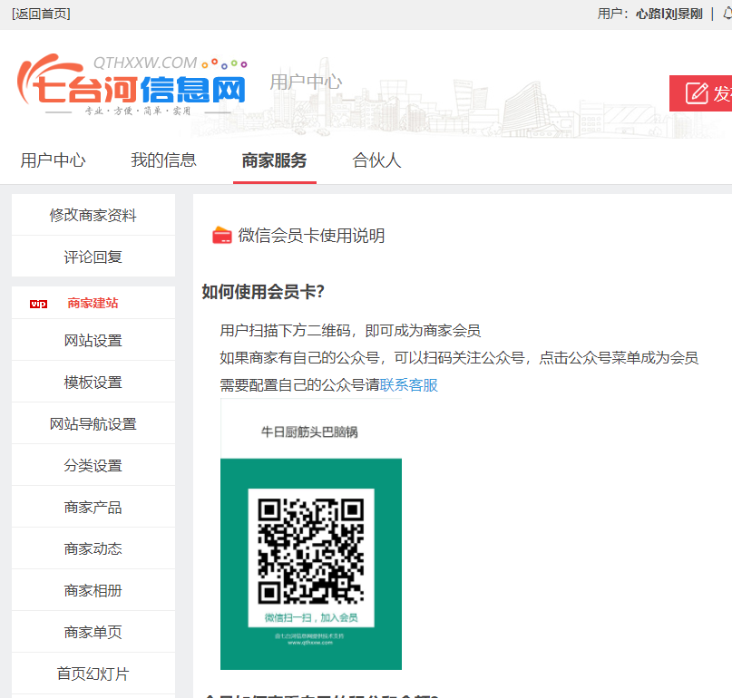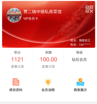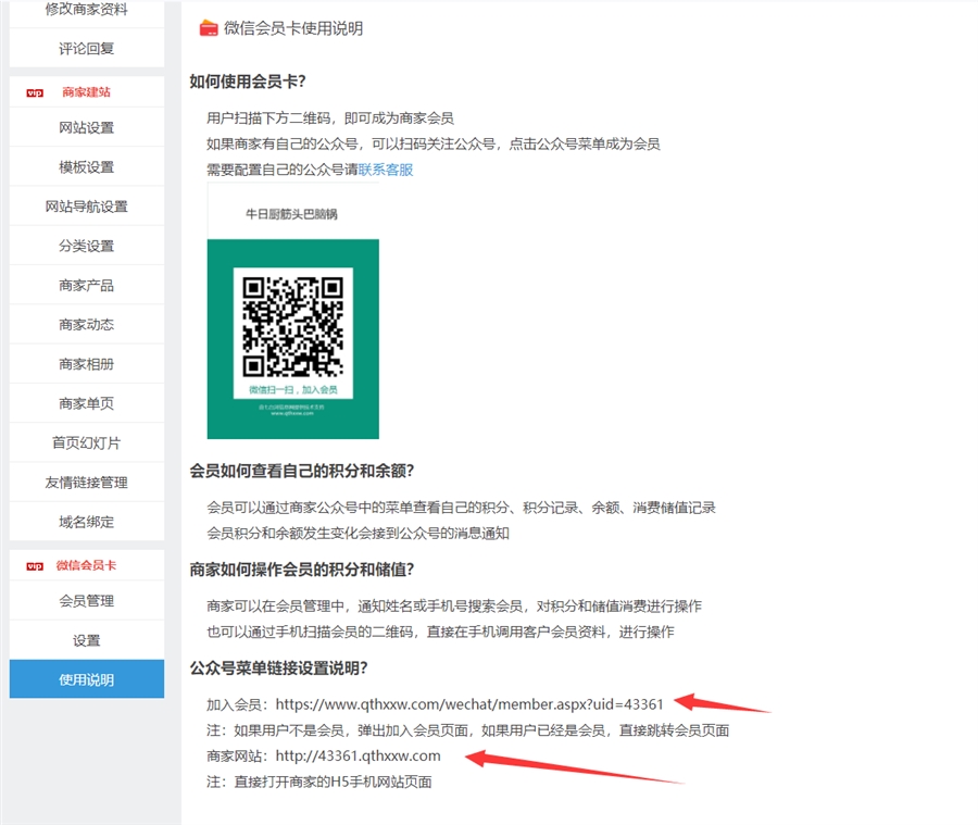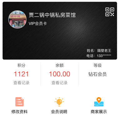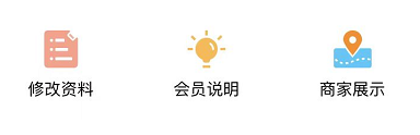 【修改资料】会员可以修改自己的会员资料。【会员说明】是商家会员卡的介绍,商家自己填写的,可以写一些优惠方式等。【商家展示】直接进入商家的网站,详细可以看框分类的商家建站功能说明。