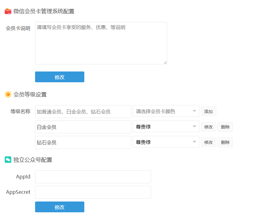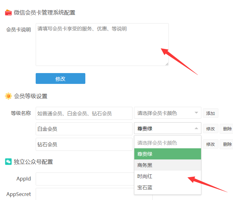 在微信会员卡系统设置中,把公众号的APPID和APPSecret填上