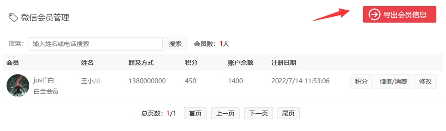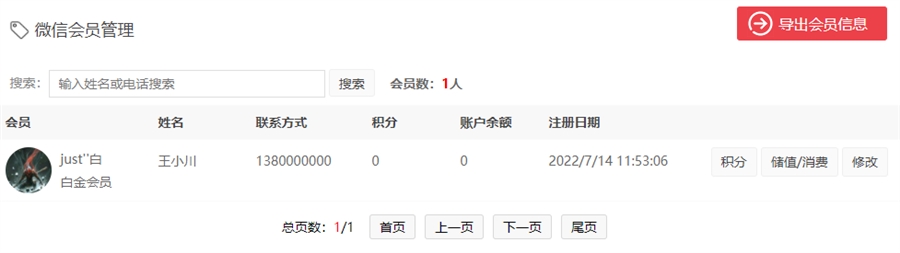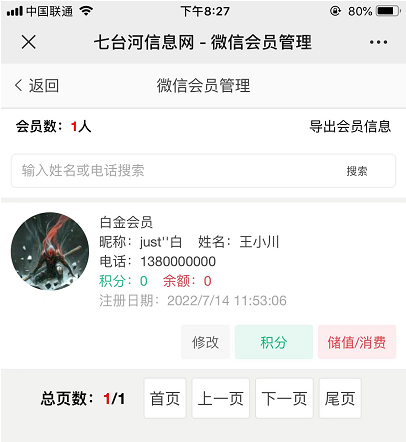 通过姓名或电话搜索会员用户,进行积分和储值操作