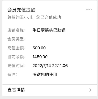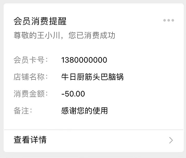 同时会员在微信中收到储值/消费/积分操作的通知消息