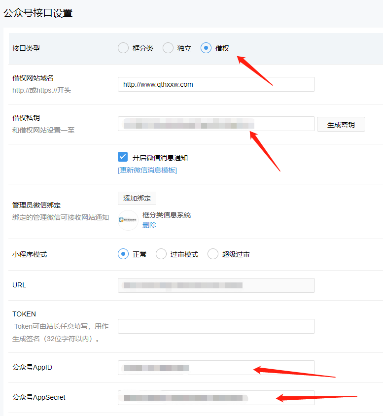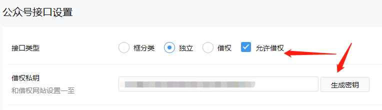 接口类型选择借权,借权域名填写主网站域名,加http://或https://。借权私钥和主网站保持一至,填写公众号的APPID和APPSecret