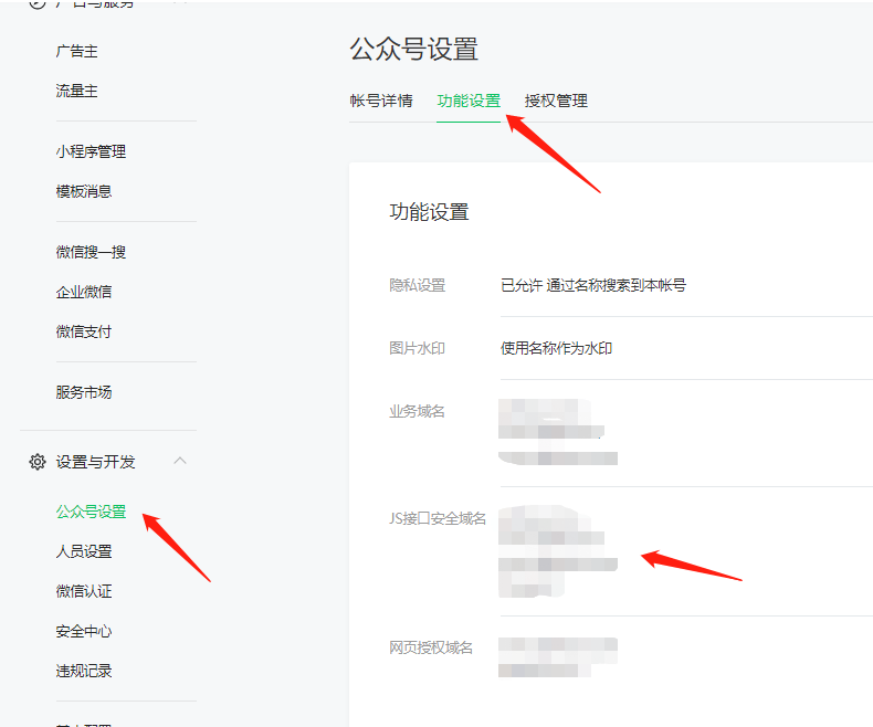最后登录公众号,功能设置中,将借权网站的域名填加到【JS接口安全域名】中,只填加主域名,不需要加www,如qthxxw.com