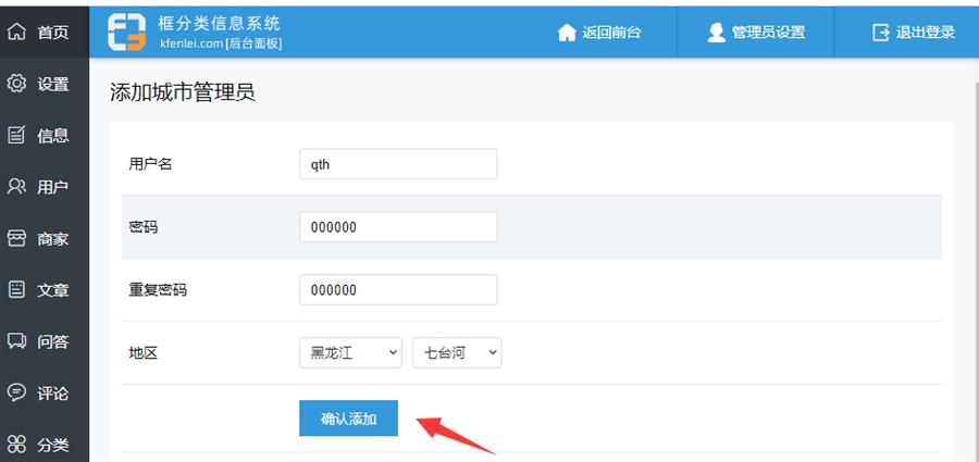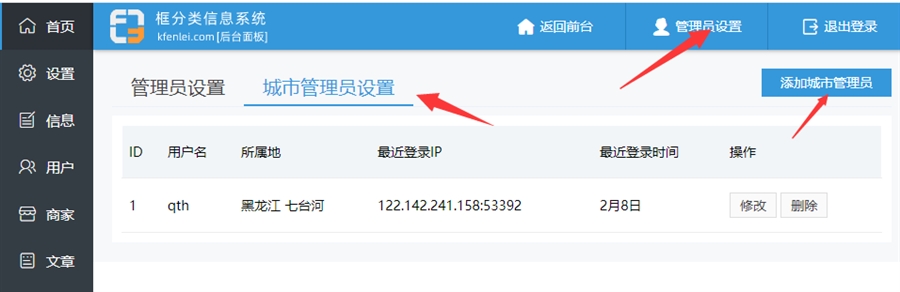登录总管理后台,选择【管理员设置】【城市管理员设置】【添加城市管理】