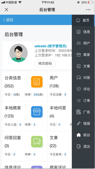 分站管理也是支持电脑和手机登录的,有开发专门的手机管理页面,登录后就可以管理当前地区的各种内容信息和添加广告