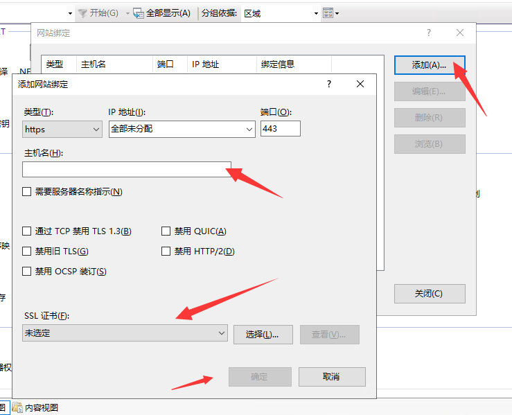 IP地址全部未分配,主机名为空,ssl证书选择刚才添加好的证书,点击确定。