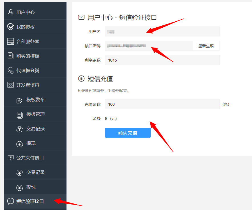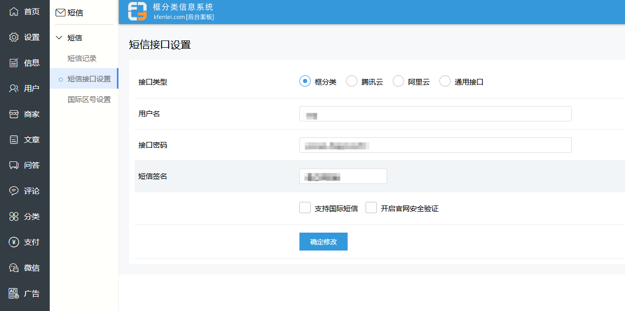 短信充值好后,将用户名和接口密码填到你的网站后台【短信接口设置】中,接口类型选择【框分类】,配置完成。