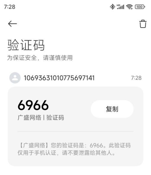 由于短信接口资质审核严格,官网短信接口无法自定义短信签名,所以签名为默认【广盛网络】,如图。