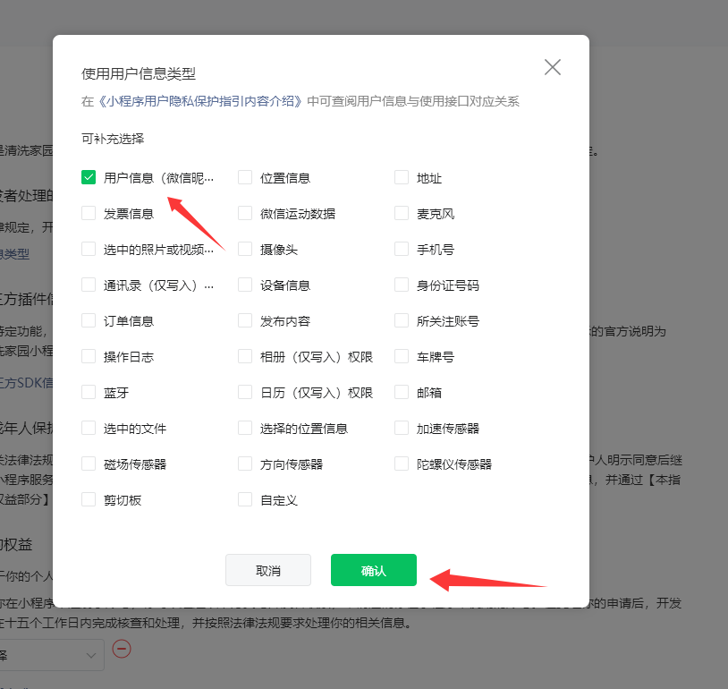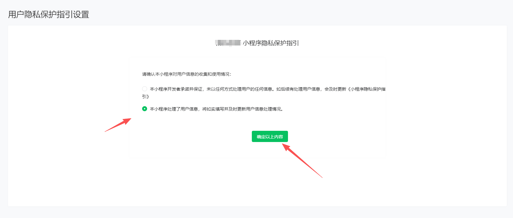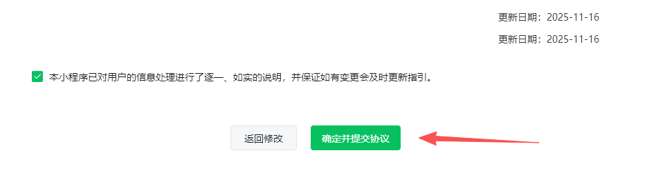 选择第二项【本小程序处理了用户信息,将如实填写并及时更新用户信息处理情况】,点击【确定以上内容】