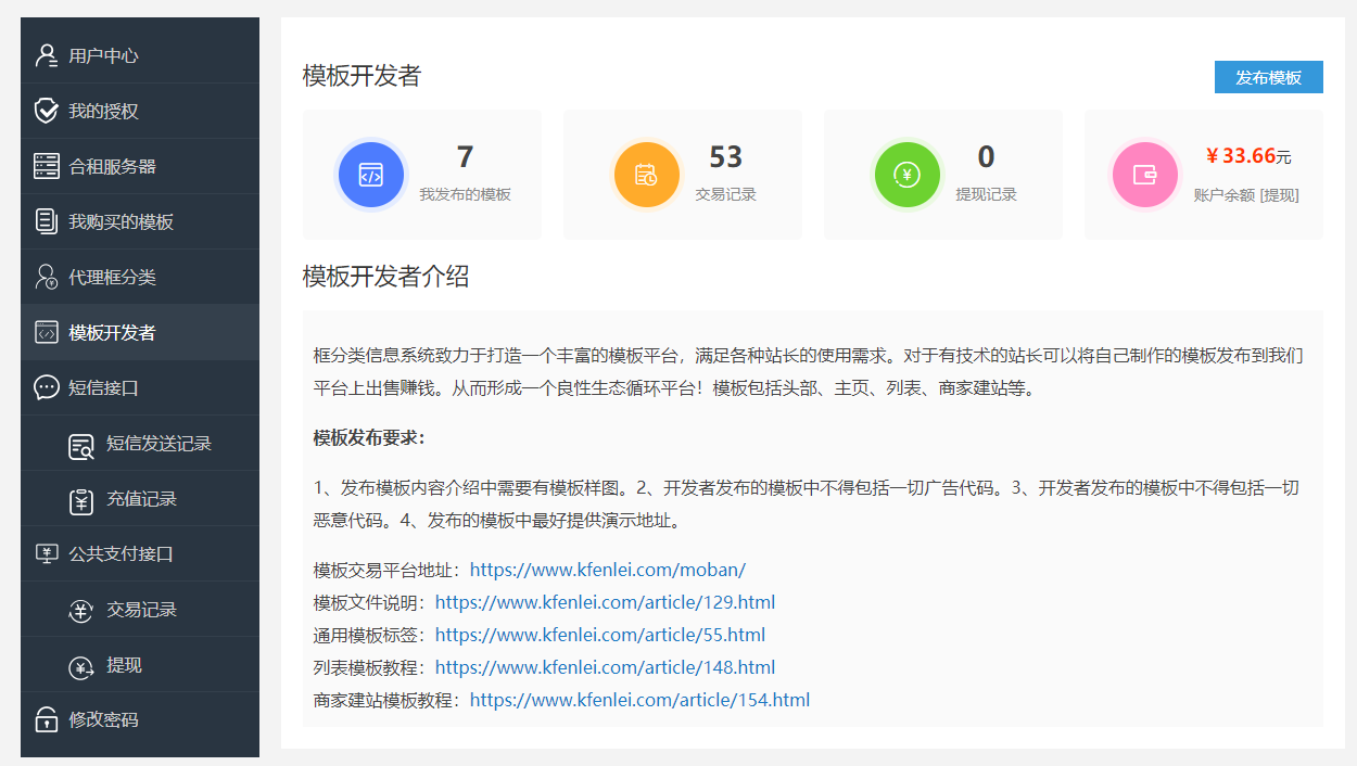 框分类信息系统致力于打造一个丰富的模板分享交易平台,满足各种站长的使用需求。对于有技术的站长可以将自己制作的模板发布到我们平台上出售赚钱。从而形成一个良性生态循环平台!模板包括头部、主页、列表、商家建站等。