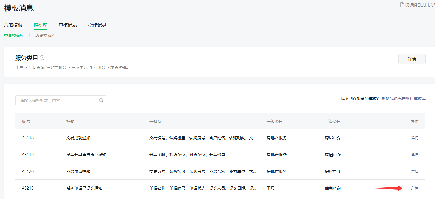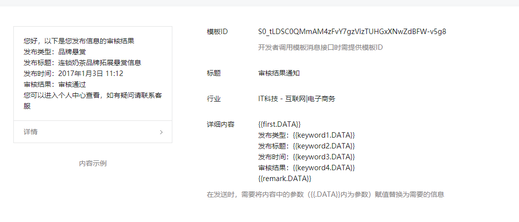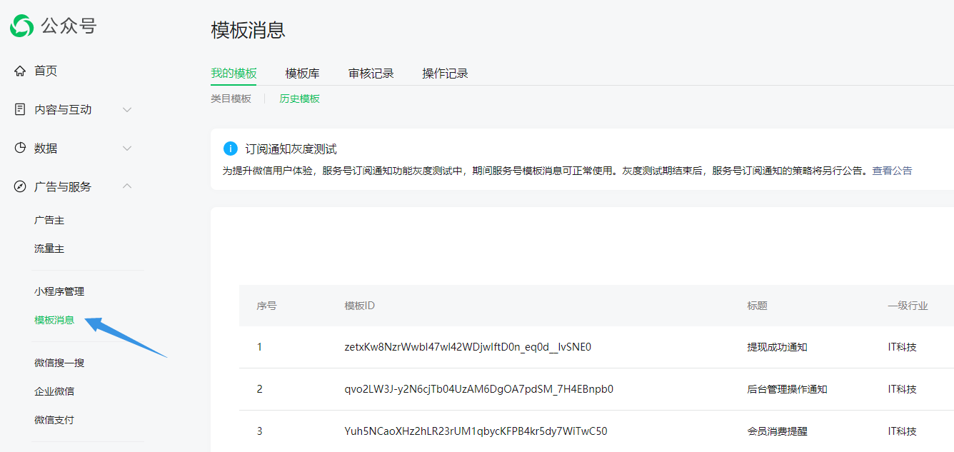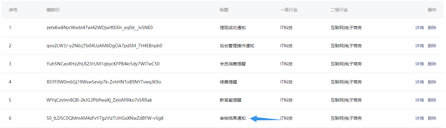 以分类信息审核通过提醒为例,这里找到合适的模板添加好后,就会有模板ID