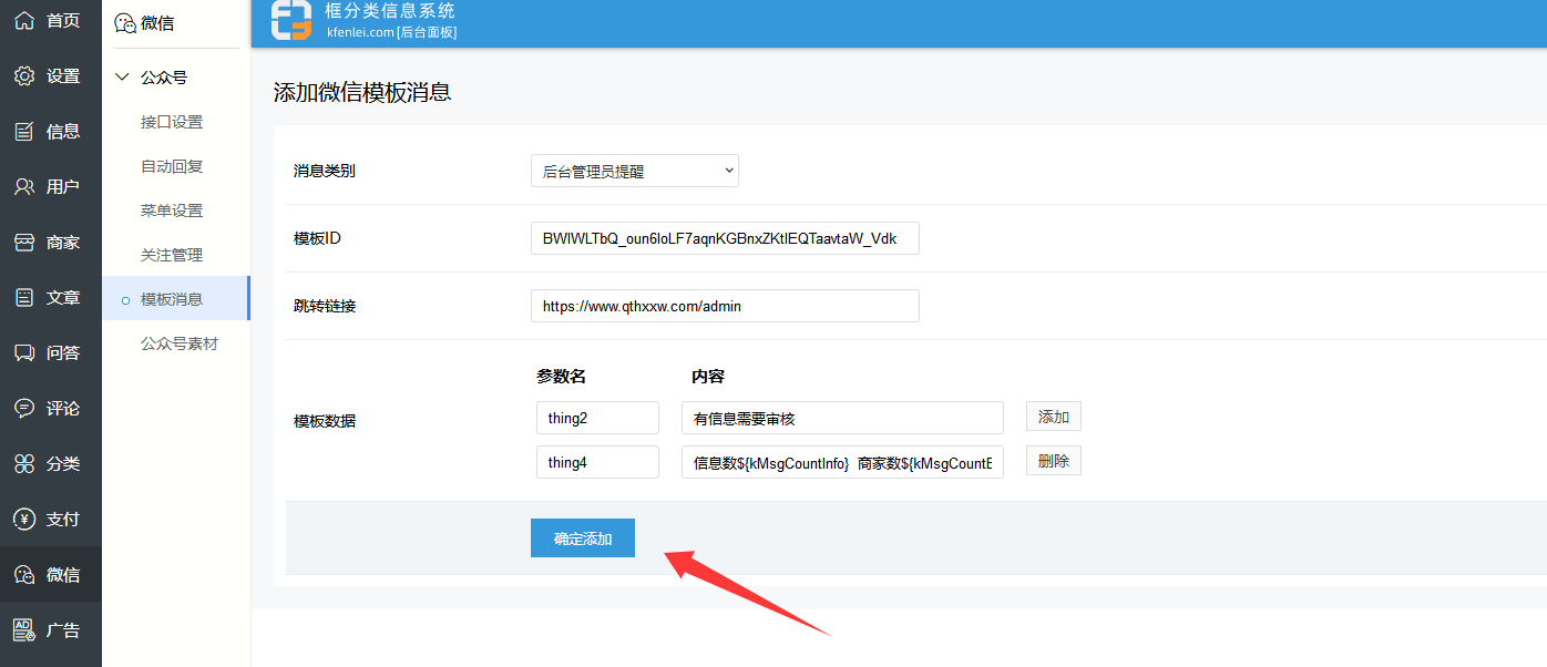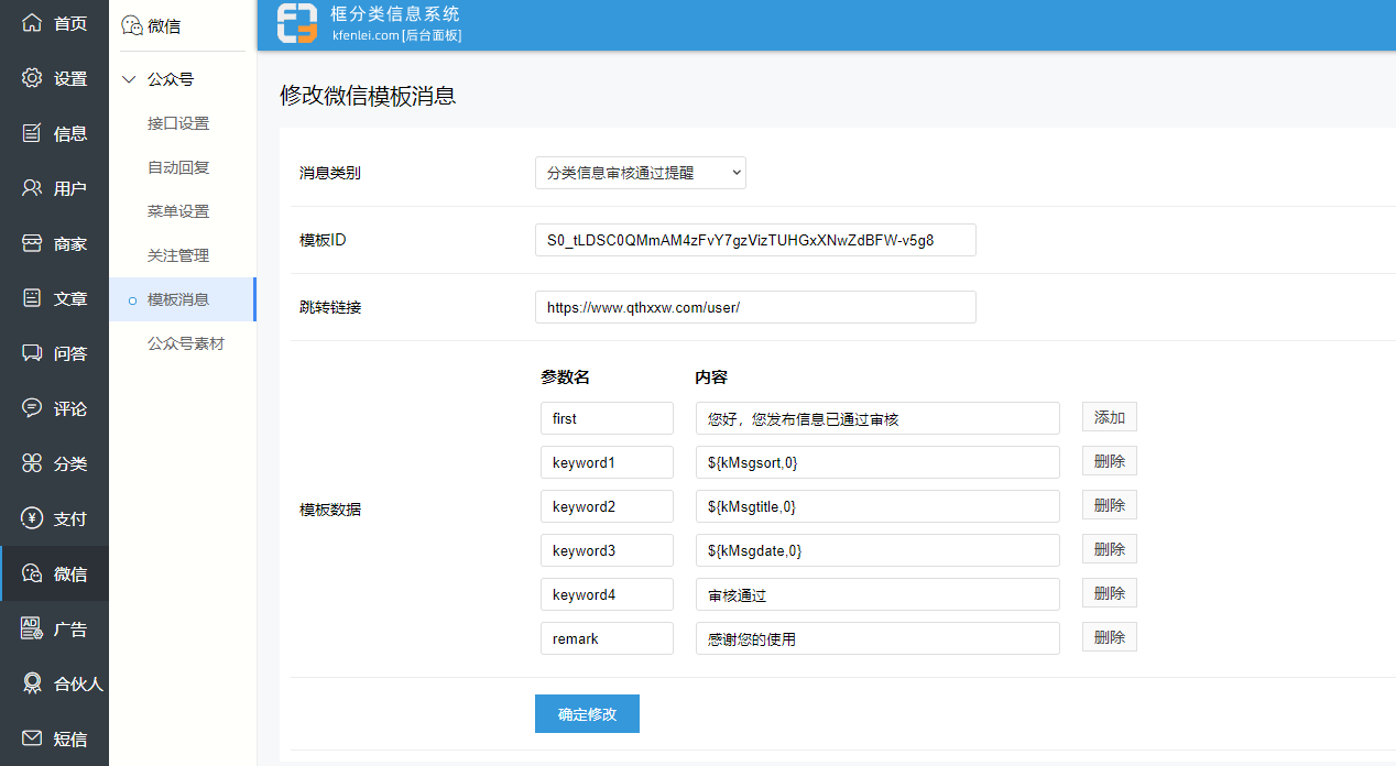 消息类别选择“分类信息审核通过提醒”,模板ID填公众号中对应的模板ID。跳转链接是用户点击消息后跳转的链接