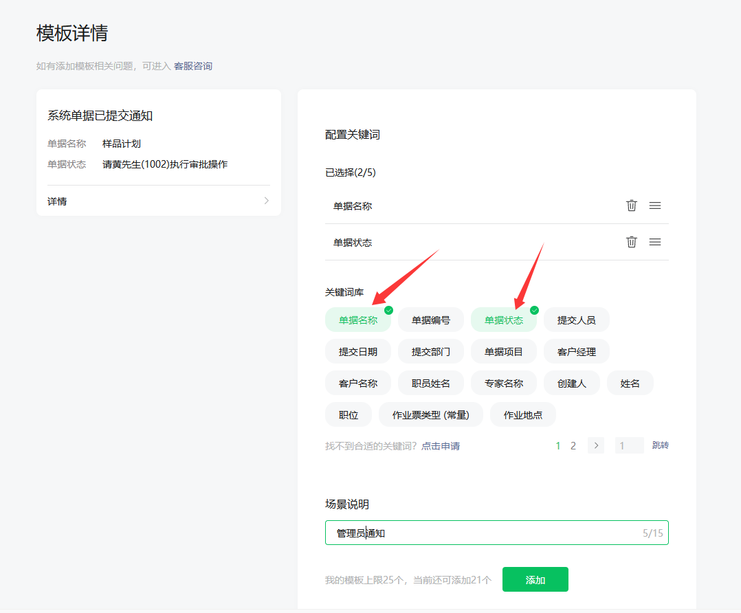 关键词库选择两项,单据名称和单据状态,点击添加。