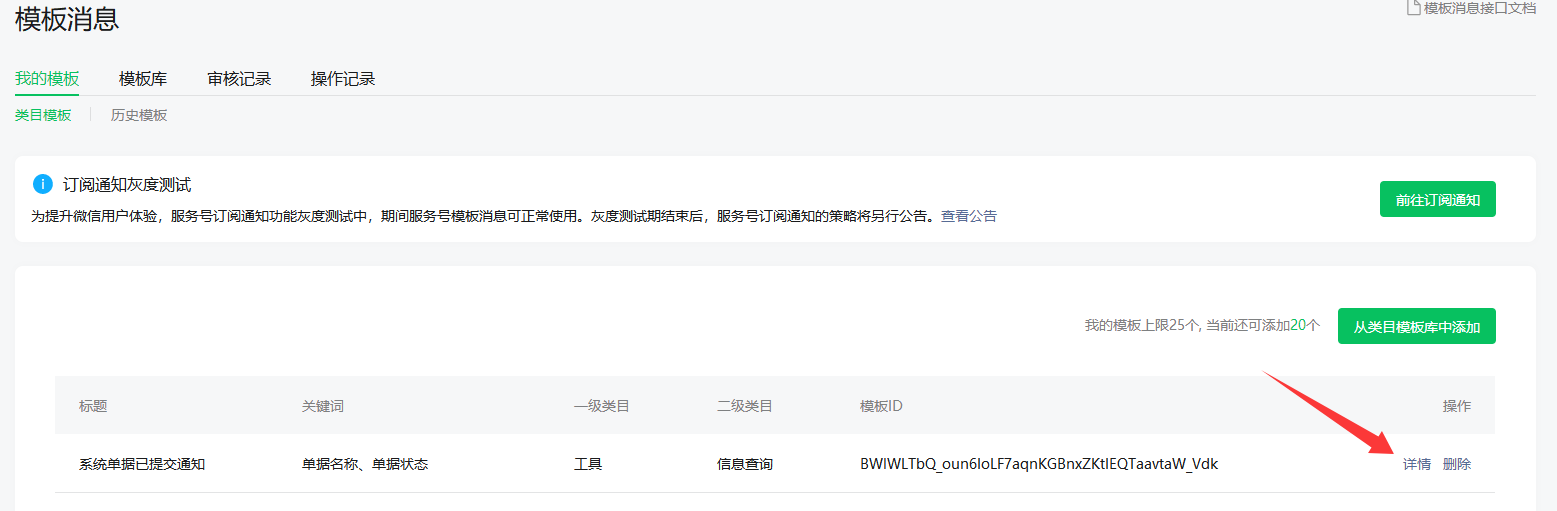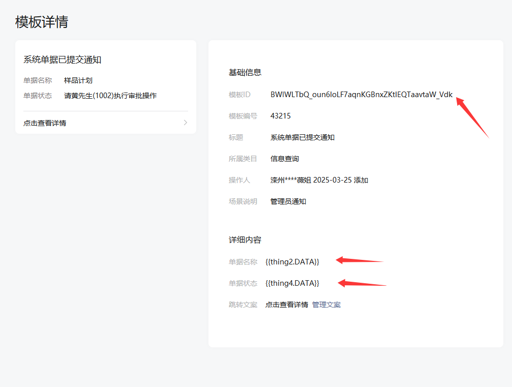点击详细就可以看到,模板ID和刚才添加的两个关键词(单据名称和单据状态)