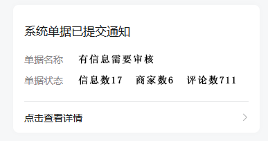 管理员审核通过是1小时最多通知一次,通知内容为需要审核的信息数、商家数和评论数。