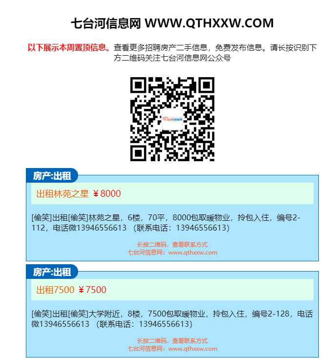 <p class="subtitle" style="text-align:center;"><strong style="color: red;">以下展示本周置顶信息。</strong>查看更多招聘房产二手信息,免费发布信息。请长按识别下方二维码关注七台河信息网公众号</p>