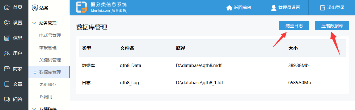 删除数据库日志,登录框分类后台,在站务 - 数据库管理中,可以看到数据库文件和数据库日志文件大小。先点击清空日志,再点击压缩数据库,数据库日志大小就会变成0M了