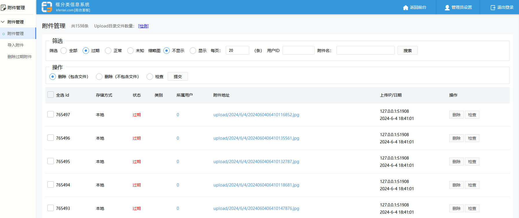 还有就是清理用户上传的图片视频文件,一些信息被删除或用户上传后未发布信息产生的无用图片视频,登录网站后台,在附件 - 附件管理中,可以查看有多少无用图片和视频。