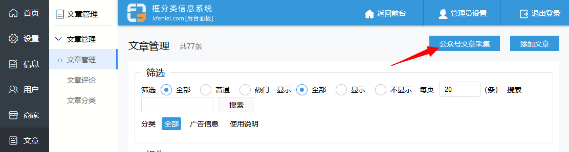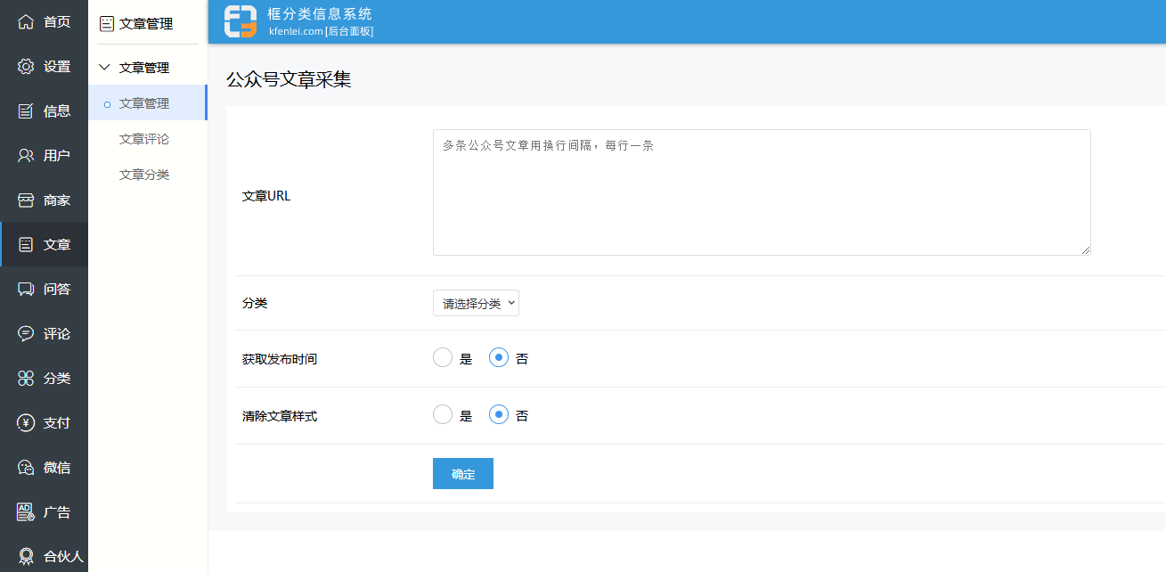 登录后台 - 文章管理,点击公众号文章采集后。在文章URL中输入公众号文章网址,每行一条,点确定,等待采集完成。