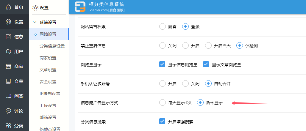 在后台 - 设置中,可以设置信息流广告的显示方式。设置为循环显示,信息列表中就会一直随机显示置顶内容。修改代码中var irandomcount=3;的数字,调整随机显示置顶的数量,如:var irandomcount=6;为随机显示6条置顶内容。