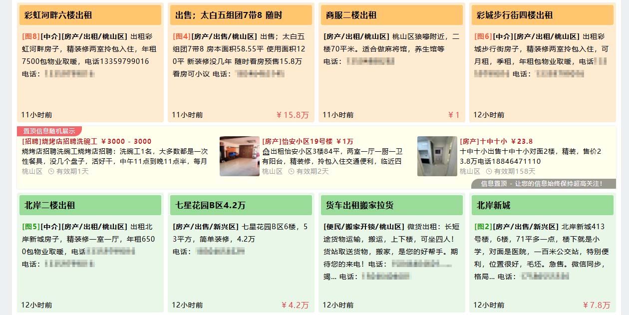 传统置顶信息只在列表前排显示,用户在浏览其它页面时,就无法看到置顶信息。为增加置顶信息的曝光度,框分类增加置顶随机信息流广告插件,每页第六条信息后随机显示三条置顶信息,让置顶更有价值,置顶不只是在前排显示,而是每页都会展示,浏览量更大效果更好,用户在浏览信息时,也会刷到各种分类的置顶广告,如招聘、转让、二手车等。经测试大大增加了用户购买置顶广告的需求。