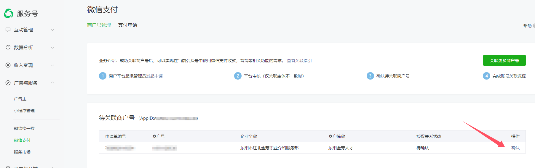 https://mp.weixin.qq.com/ 在微信平台登录你的公众号或小程序,在微信支付中,找到待关联商户号,点击确认。