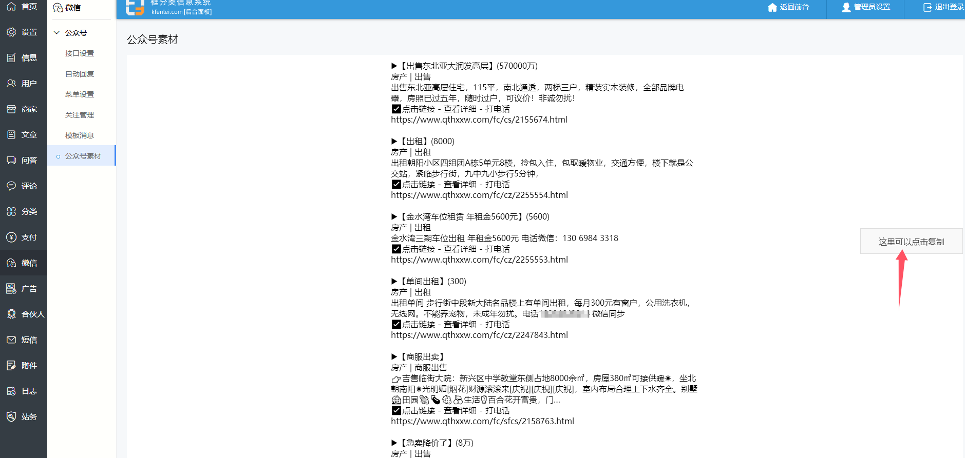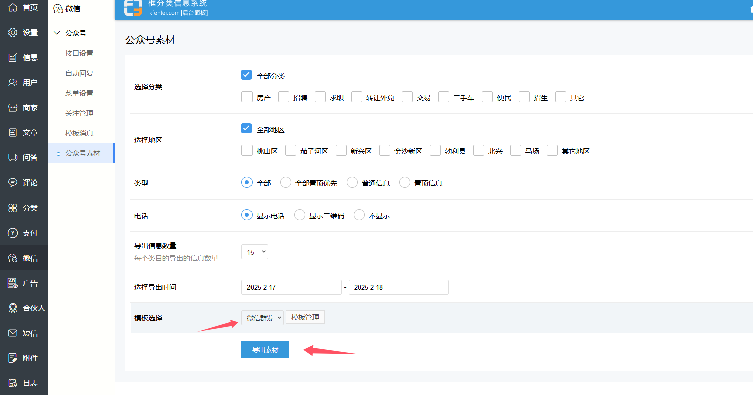 添加完成后,在公众号素材中,根据需要选择要导出信息的分类、地区,时间范围。模板选择【微信群发】。点击导出素材。就可以导出微信群发文本了