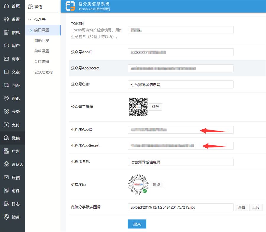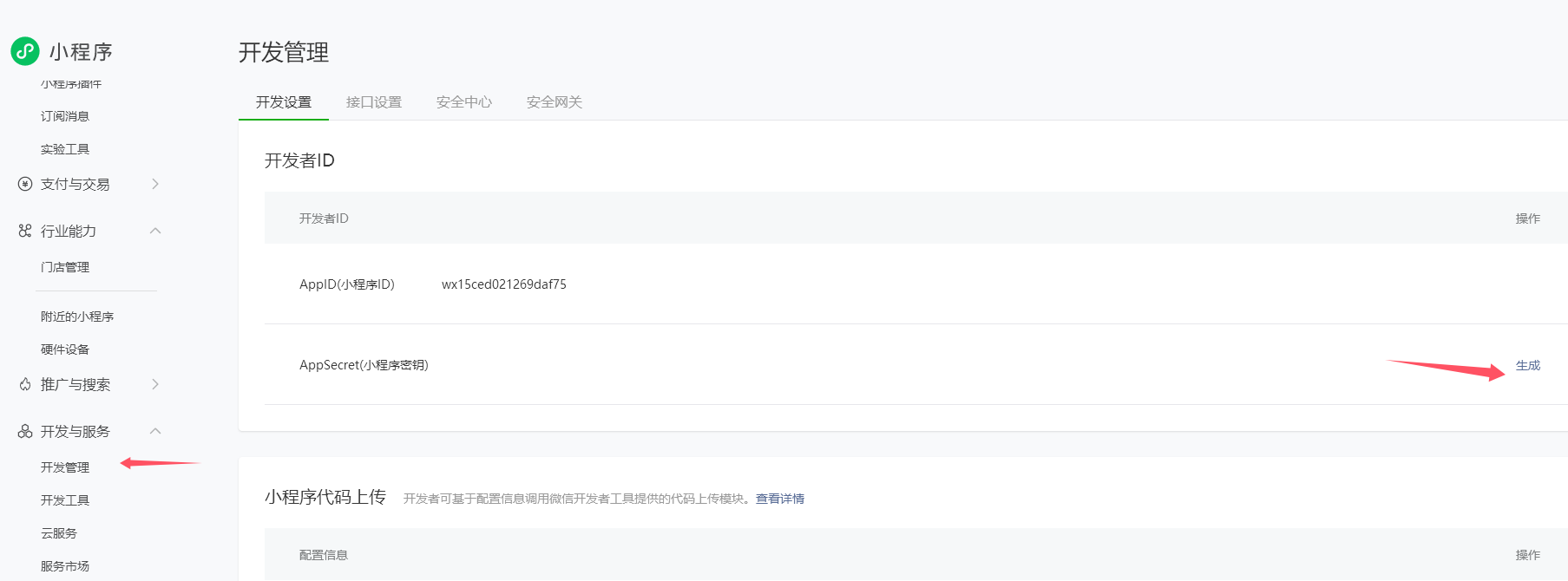 把APPID和Appsecret 复制填到网站后台的微信 - 接口设置的微信小程序APPID和微信小程序APPSECRET中。