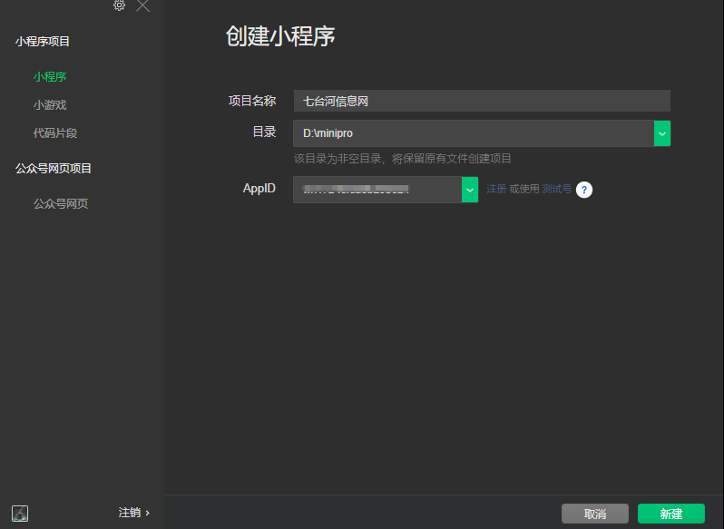 APPID 填你小程序的APPID 然后点新建