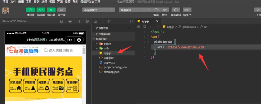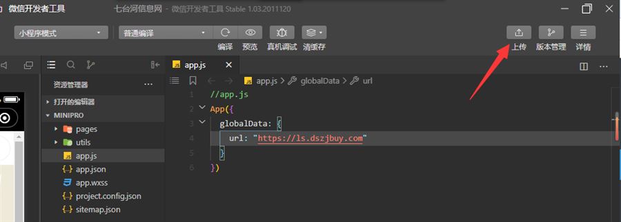 导入后,点击app.js 把这里的网址改成你的 注:要用https://,修改好后保存。