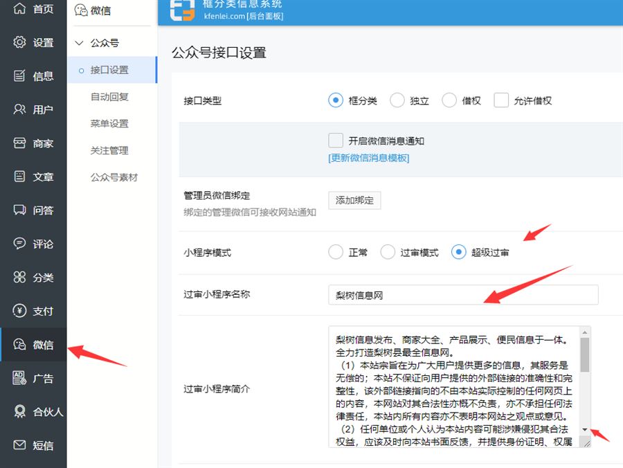 在框分类后台 - 微信 - 接口设置,有小程序过审模式。开启这个模式,填一下过审小程序名称和过审小程序说明。过审小程序名就填网站名,过审小程序说明填网站简介,开启过审模式后,小程序会显示普通的商家页面,更容易审核通过。审核通过后,关闭过审模式就恢复正常的框分类信息系统的功能了