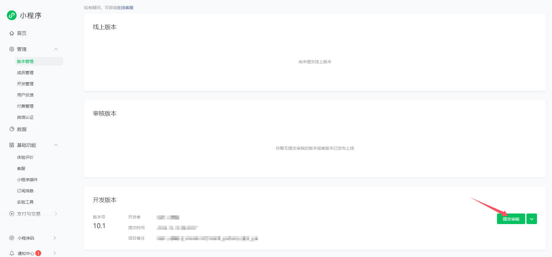上传后,登录小程序管理平台。版本管理,找到刚才上传的版本,点提交审核。