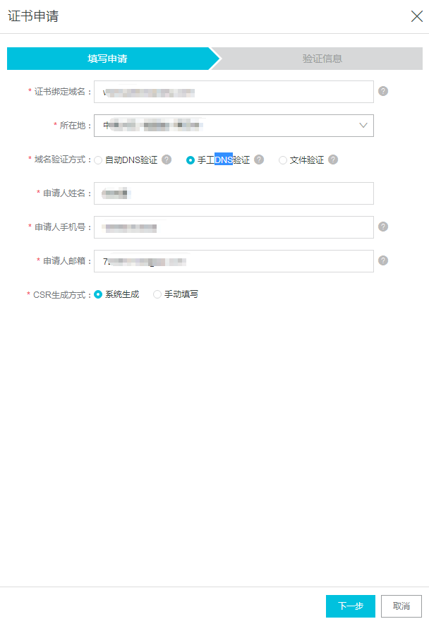 域名验证选择手工dns验证,其它验证方式也可以,这里只演示手工dns验证