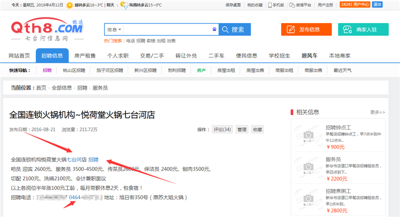 这条信息内容中的几个关键词已经加上了链接,其中“七台河”链接到了首页、“招聘”链接到了招聘版块。