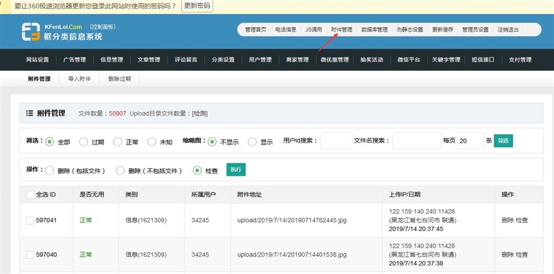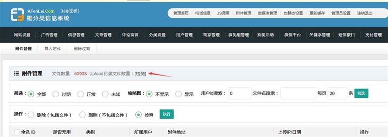 先点一下附件管理中的检测,可以检查到网站的上传图片数量,如果检测出来的数量比显示的文件数量大,就要把没有记录的文件导入